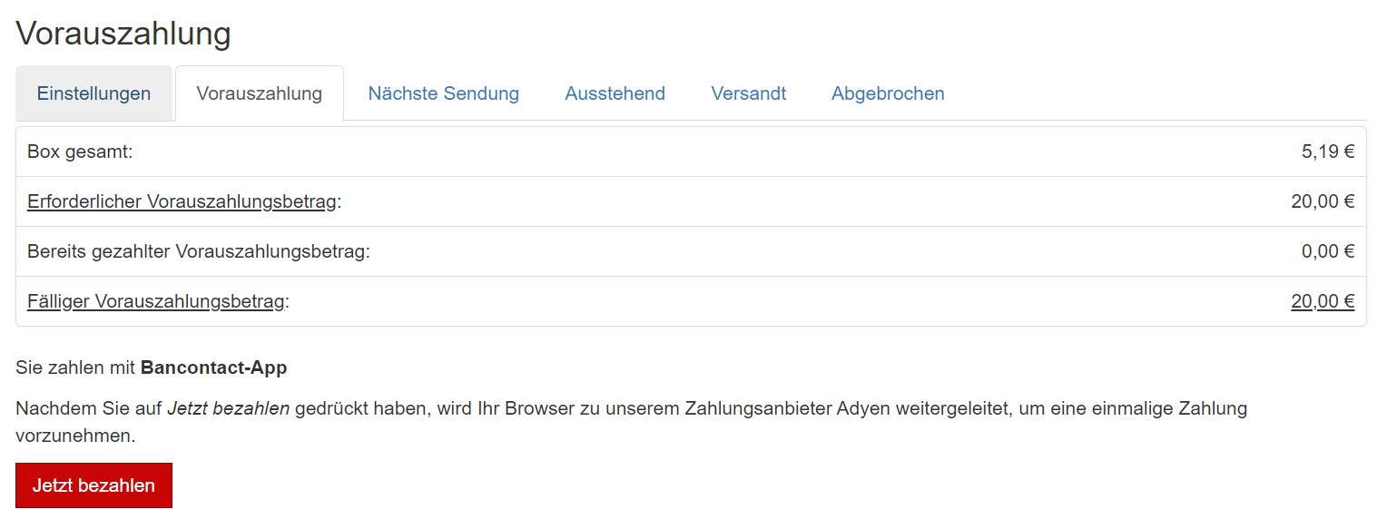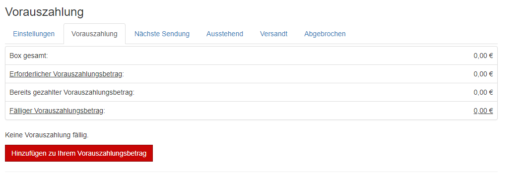 Wenn Sie Ihrer Box Artikel hinzufügen, müssen Sie immer einen Vorschuss zahlen. Alle Informationen über diesen Vorschuss finden Sie hier.