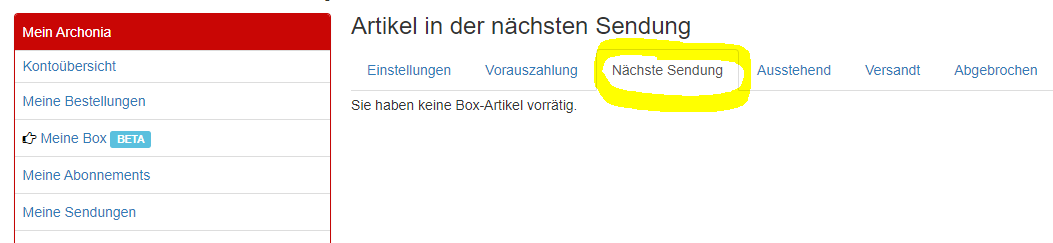 Natürlich möchten Sie wissen, wann Sie Ihre nächsten Artikel erhalten. Unter "Nächste Sendung" sehen Sie alle Artikel, die in Ihrer nächsten Sendung enthalten sein werden.