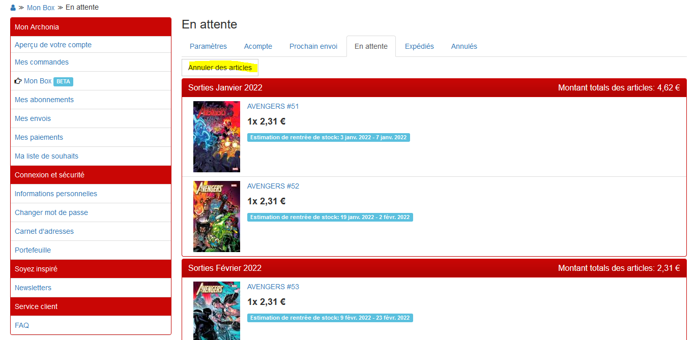 Veuillez cependant noter que, en cas d’annulations successives et excessives, votre Box pourra être désactivé. Nous vous demandons donc de bien considérer quels articles vous souhaitez rajouter à votre Box avant de ne placer votre commande pour ceux-ci.